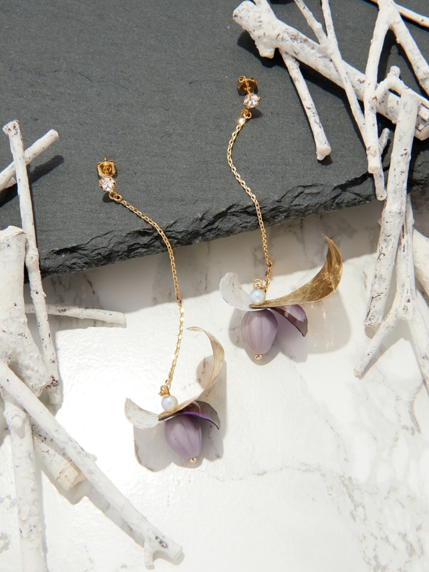 長めにとったチェーンの先に見たこともないような花。花びらは各々違う色、それが妖艶で奇妙な不思議な雰囲気を醸し出しています。